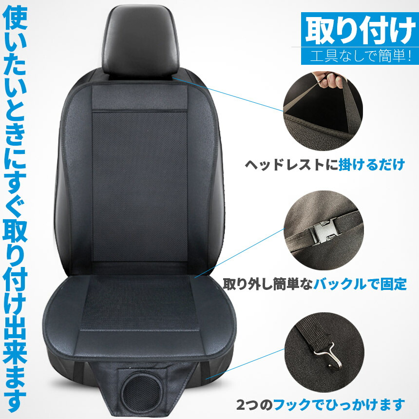 取り付けは、ヘッドレストにゴムバンド、腰元に腰元に簡単取り付けできるバックル、足元にフックでひっかけるだけ!工事不要で楽々使いたいときにでサッとつけるだけ♪付属のシガー電源でつないで簡単操作のリモコンでカチっとあっという間に送風開始。2段階で風量も調節できます。足元のファンから座席全体に均一に風を送り込む設計で、乗ってすぐの熱い車内で背中、座面から体温を下げる、エアコンをいつもより弱めて省エネ、あると必ず役立つ便利グッズです♪
