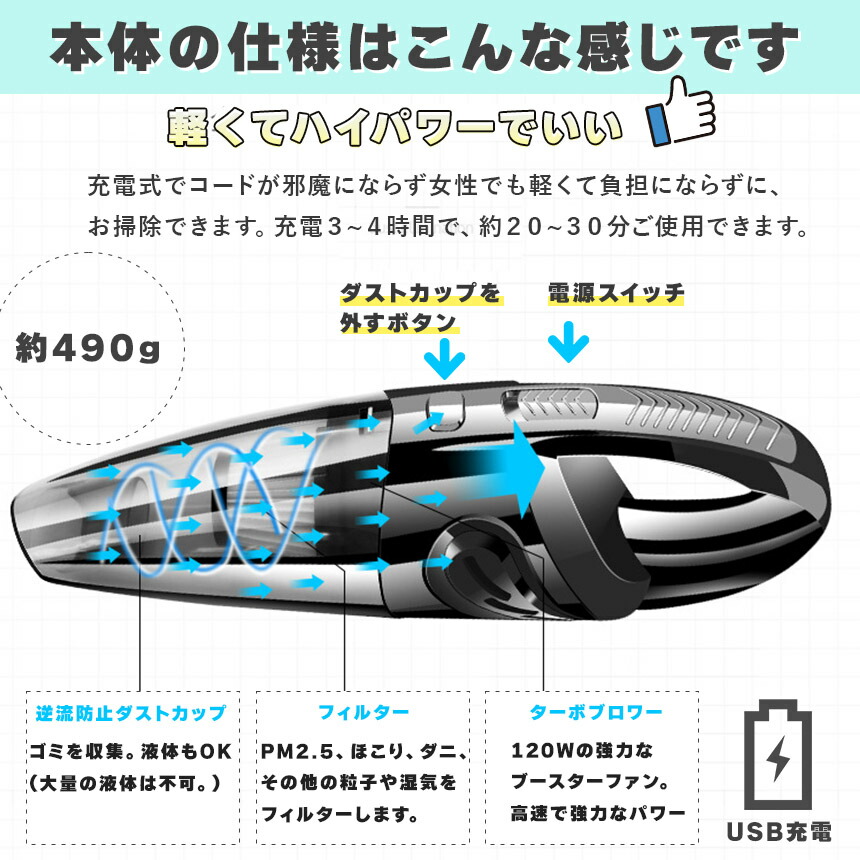 付属の充電ケーブルをUSB充電対応の物にさして充電してください。充電時間は約3~4時間で、20~30分ご使用できます。本体側はTYPE-Cとなっています。ACアダプタは付属していませんので、お持ちのモバイルバッテリー、PC、ACアダプタ、お車のUSBポート等をご利用ください。ワンプッシュでごみが捨てれる簡単設計。