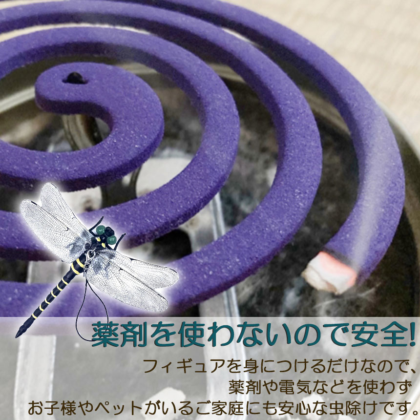 蚊・ハチ・アブ・ハエなどにとって天敵のオニヤンマの模型を身に着けることで害虫が寄ってこなくなる効果が期待できます。