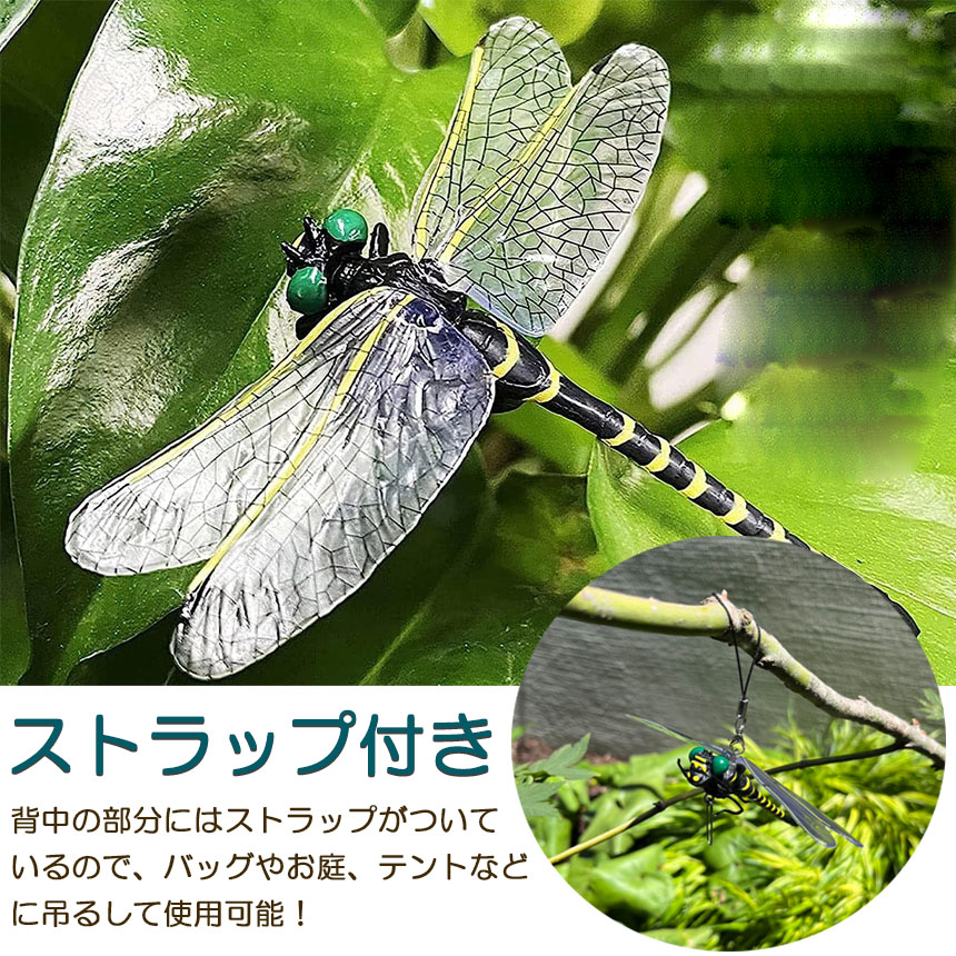 オニヤンマの背中側にストラップがついているので、鞄やお庭、テントなどに吊り下げてしようできます。