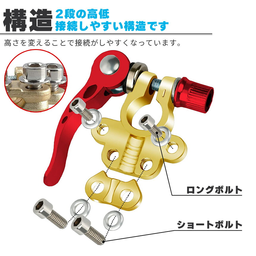 複数のケーブルを接続するための、特別設計された4つの端子があり、高さを変えることにより接続しやすくなっています。