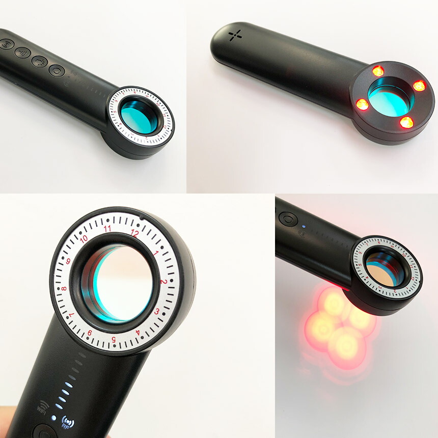 ・カメラレンズに反応する赤外線レーザーとフィルターで目視でカメラを探すことができます。電波を発していないカメラを探すときに活用できます。点滅パターンを変え、より分かりやすく発見しやすくできます。
