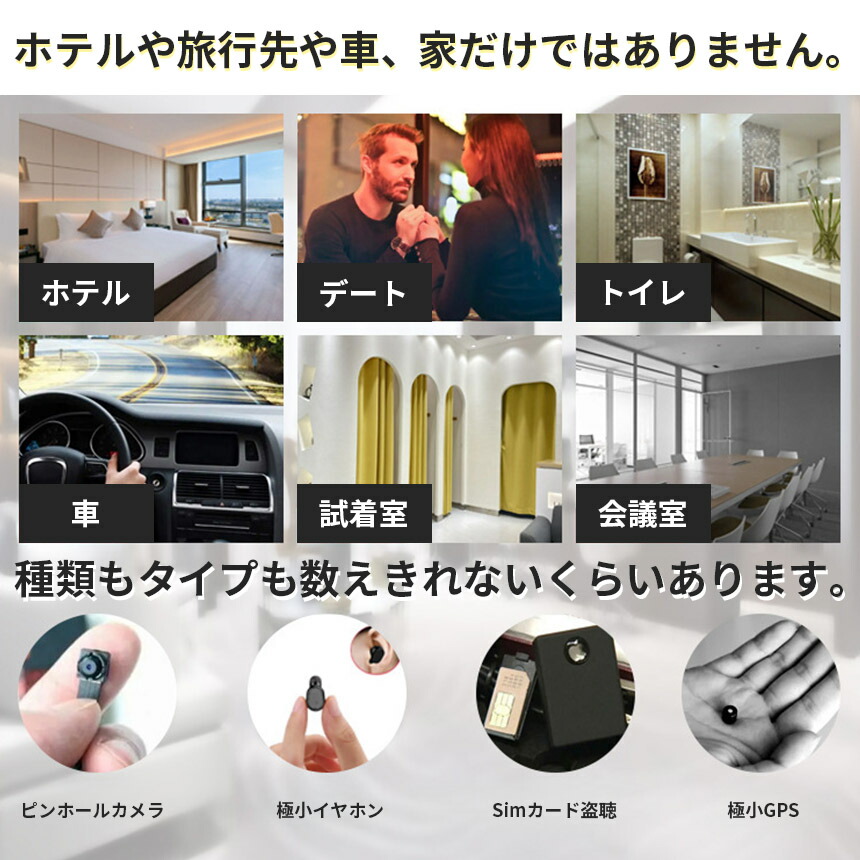 最近は、誰でも簡単に高性能な隠しカメラ、盗聴器、GPS機が入手できます。ストーカーなどの場合だけでなく、泥棒などが事前に情報を入手するため、個人情報を盗むため、GPSを車などに簡単に設置、等々数えきれないパターンがあり、あなたも被害者に十分なりえます。まさか自分が...といったケースが増えていますし、ぜひ、今一度ご自分と家族を守るための行動を心がけで頂きたいです。
