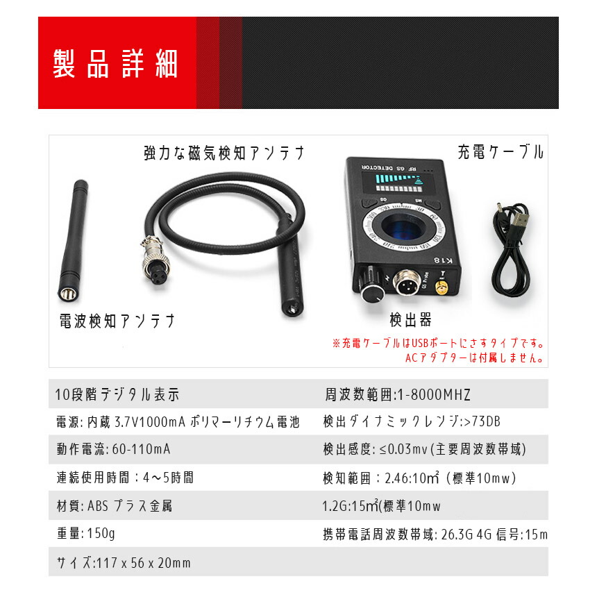 ・盗聴器、隠しカメラ等の電波を検知し、ピーピーと音でお知らせ(振動モード時は振動)します。また、電波強度も10段階のインジゲータでお知らせ。7を超えると音が鳴ります。