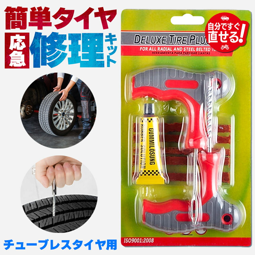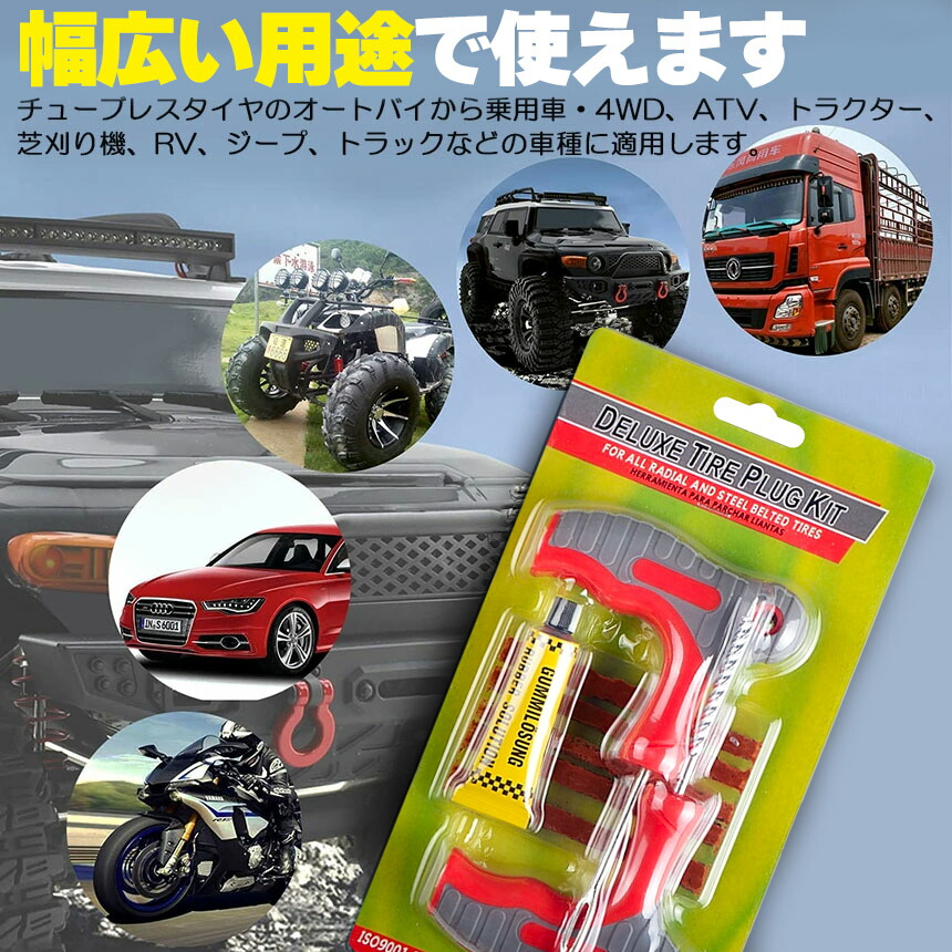 自分で簡単にすぐパンク修理できます。チューブレスタイヤのオートバイから乗用車・4WD、ATV、トラクター、芝刈り機、RV、ジープ、トラックなどの車種に適用します。