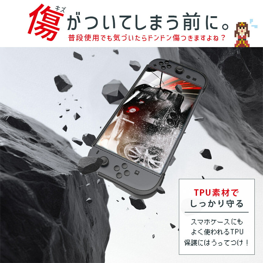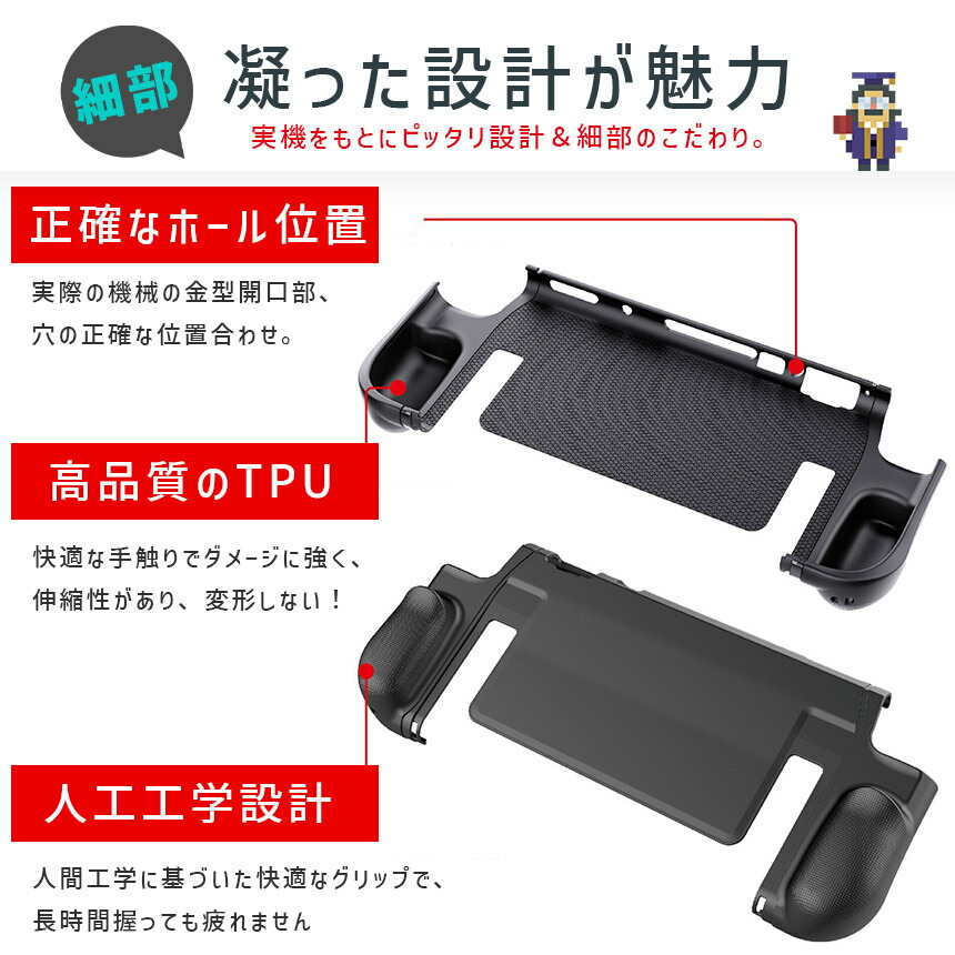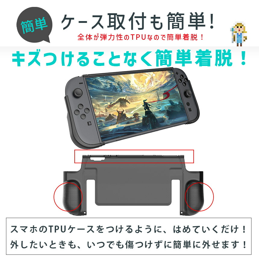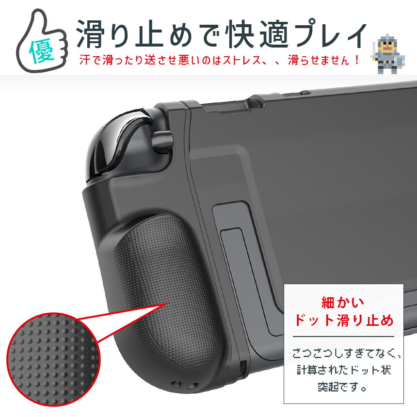 弾力があり耐久性もある高品質TPU素材を使ったケースなので、しっかり保護してくれ、変形もしにくく、世界でも幅広くつかわれています。実機をもとに設計も細かくされているため、簡単着脱な上、ピタッとハマります。グリップも滑り止めもついていて、快適にゲームプレイできます。屋内保管はもちろん、旅行や友達の家、持ち運びにも傷の心配なく大活躍!