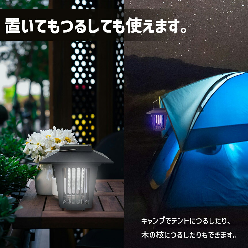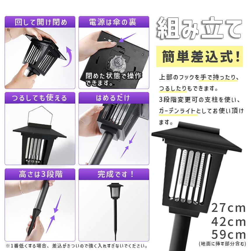 玄関先、お庭、アウトドア、キャンプで大活躍!つるしたり、地面に差し込んだり、多用途のソーラー殺虫ガーデンライトです。