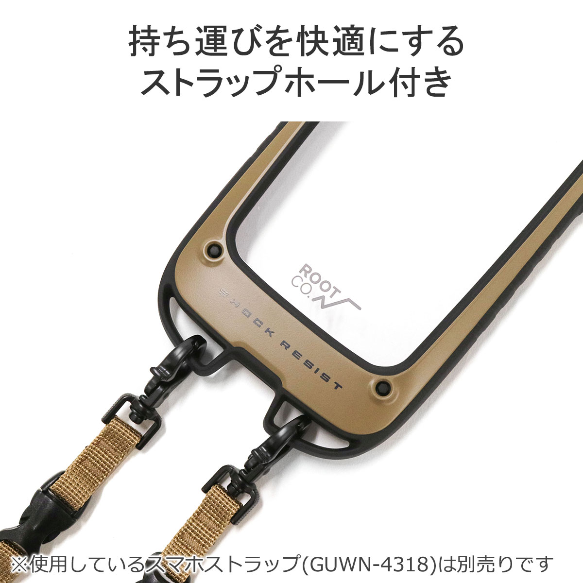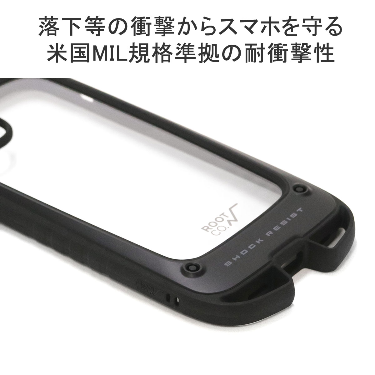 非常にタフな本体は、スマートフォンを落下等の衝撃から保護します。(米国環境耐性試験「MIL-STD-810G 516.6Procedure 4」の耐衝撃試験に準拠)さらにケースの角のTPUを厚くすることで、落下時の衝撃を吸収してくれます。またケース下部両角には、お好みのストラップ、カラビナを取り付ける事が可能になっています。
