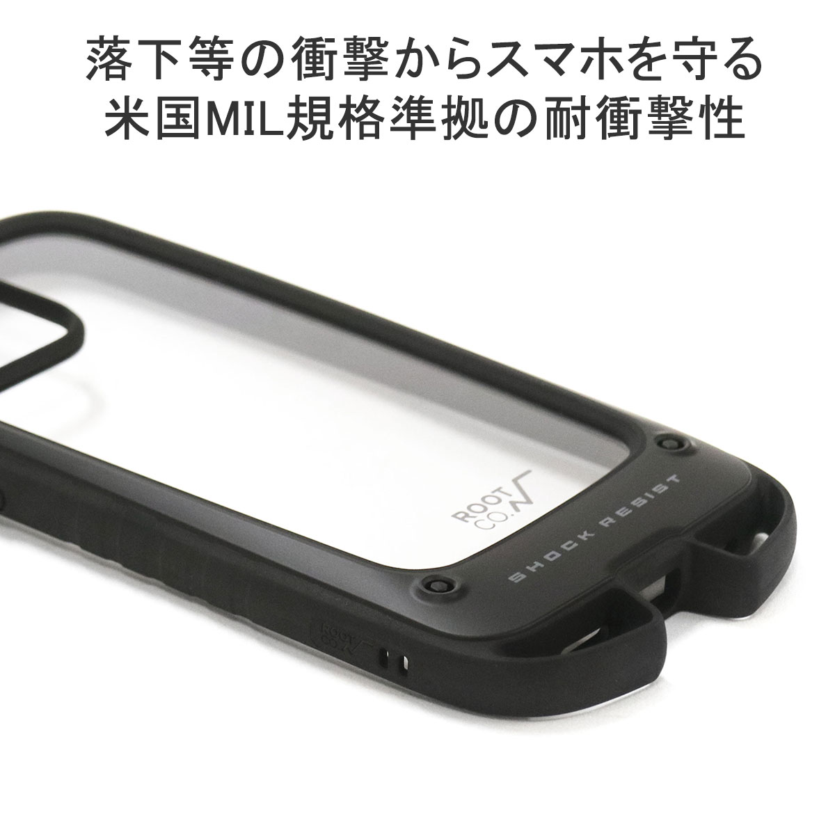 米国MIL規格準拠の耐衝撃性と衝撃吸収力を兼ね備えながら、スリムで持ちやすいiPhoneケース。こちらは、iPhone15ProMax対応のモデルです。下部のカラビナループは2つに分割されており、アクセサリーの取り付けやすさに長けています。アップルマークが見えるクリアな背面パネルを採用し、iPhoneのデザインを活かすルックスも魅力のひとつです。