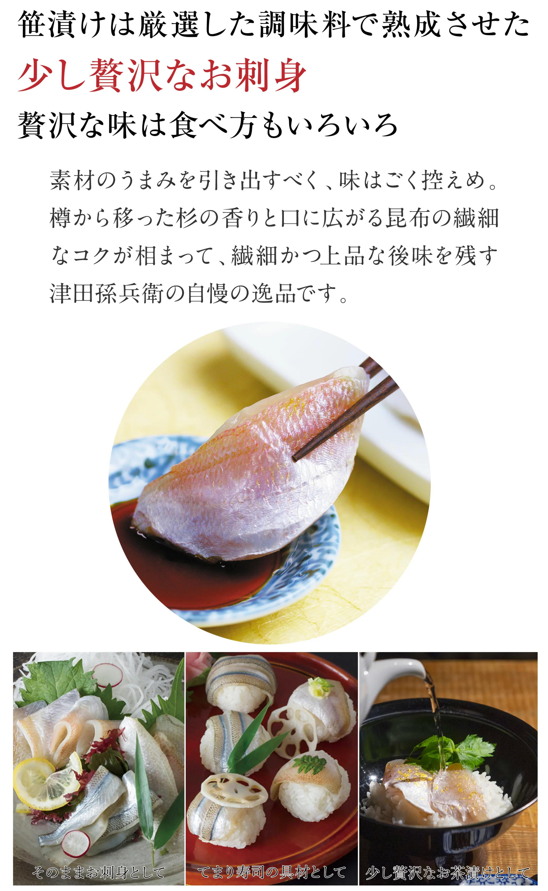 津田孫兵衛の笹漬けは、創業以来すべて手作り、300年以上の経験に基づいて作り続けてます。